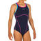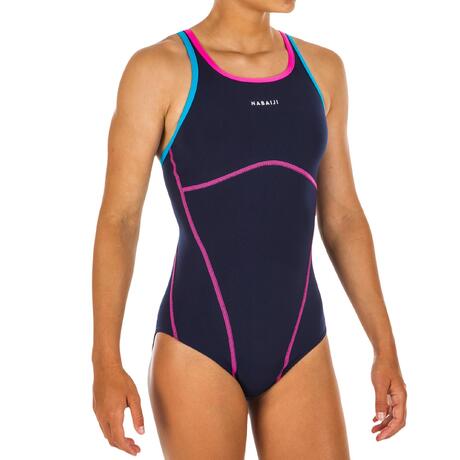 Extremely chlorine-resistant girl's one-piece swimsuit with a high cut design ideal for training.